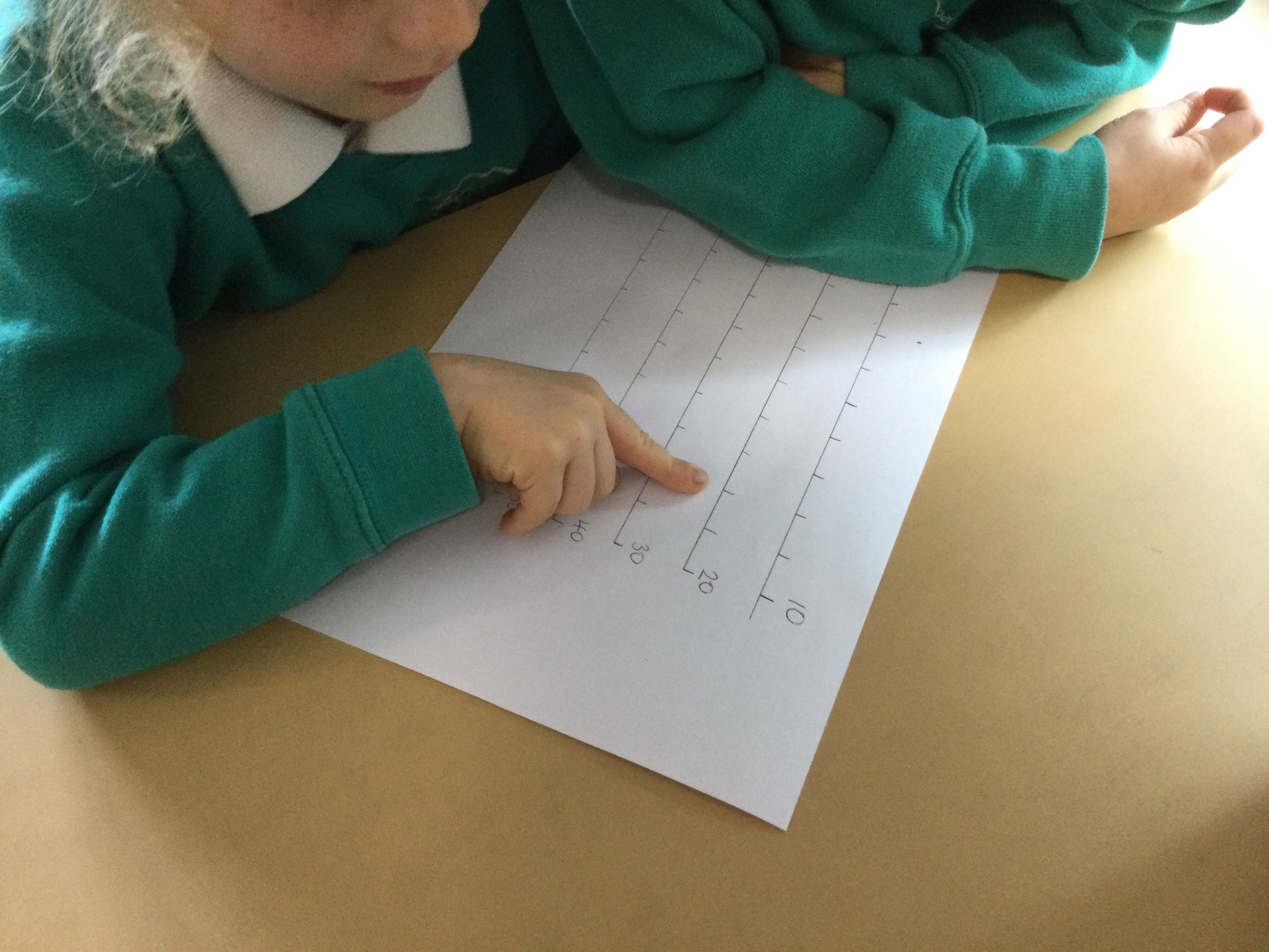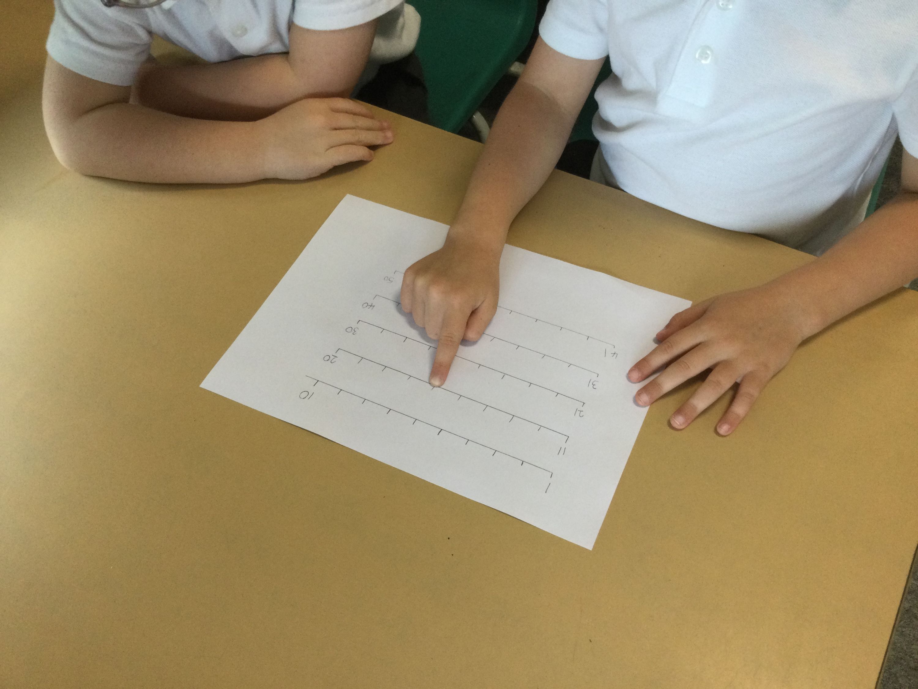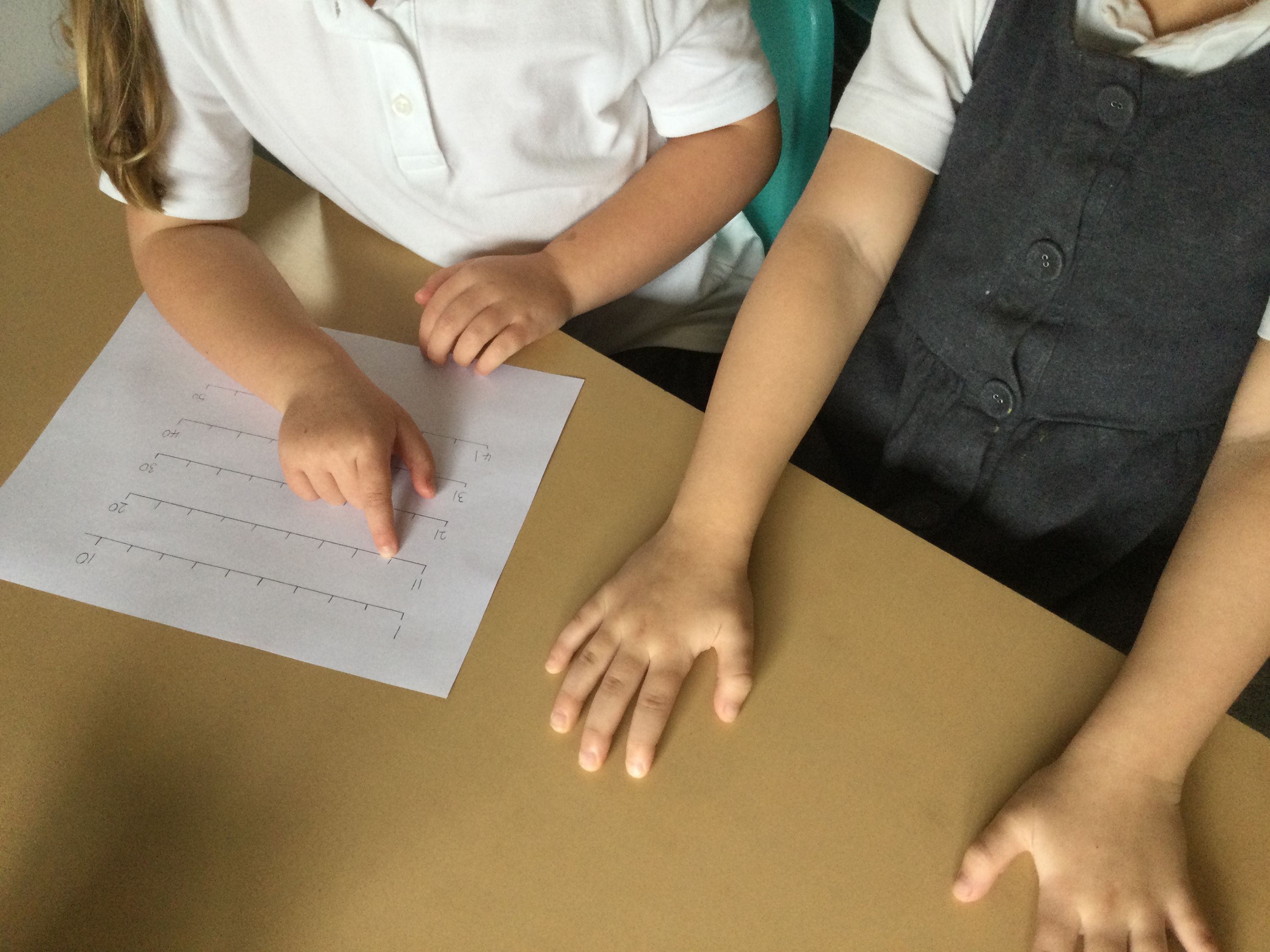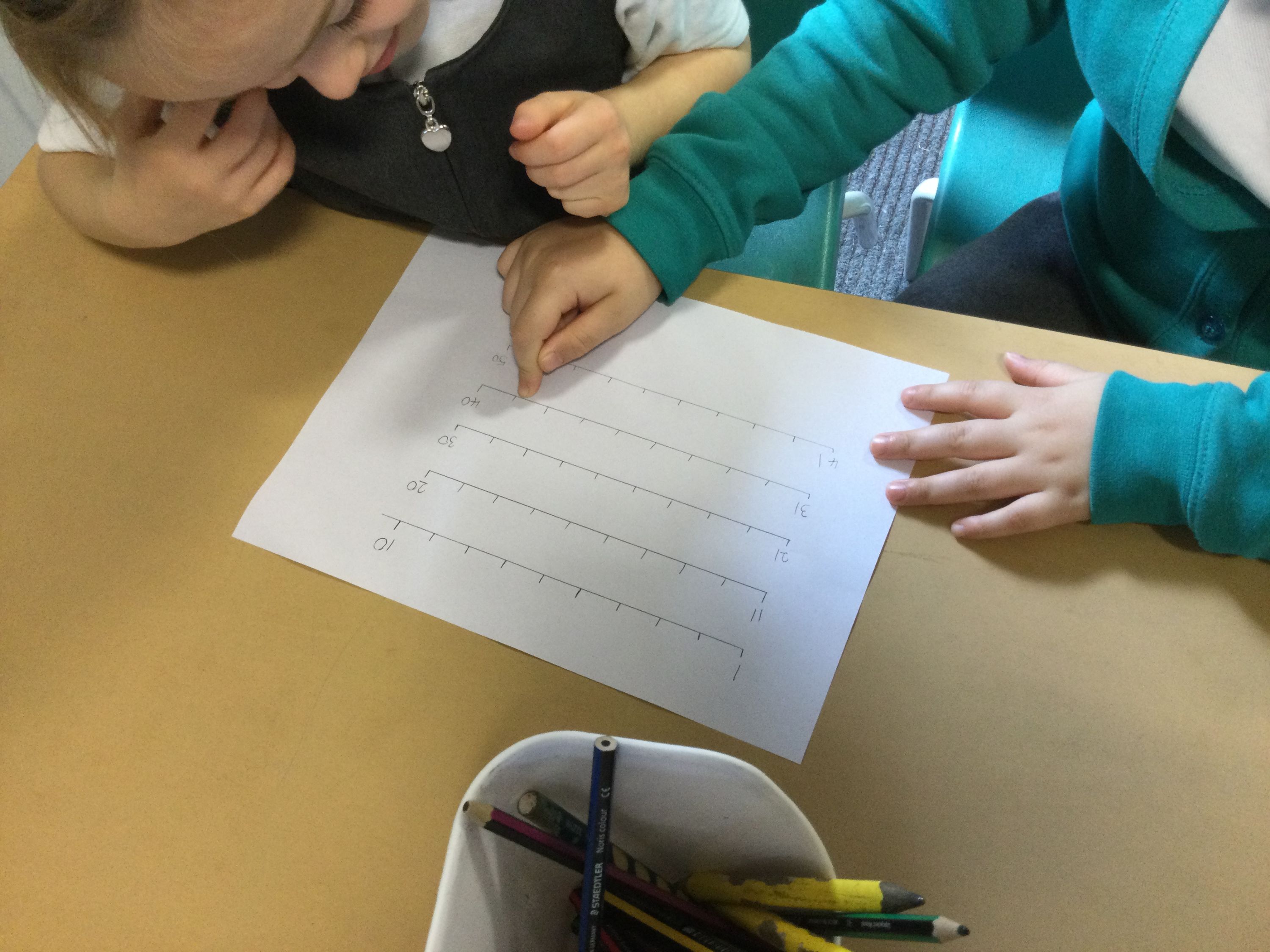 The children have been counting, focusing on the numbers that come before multiples of 10. Here they are practising with each other.