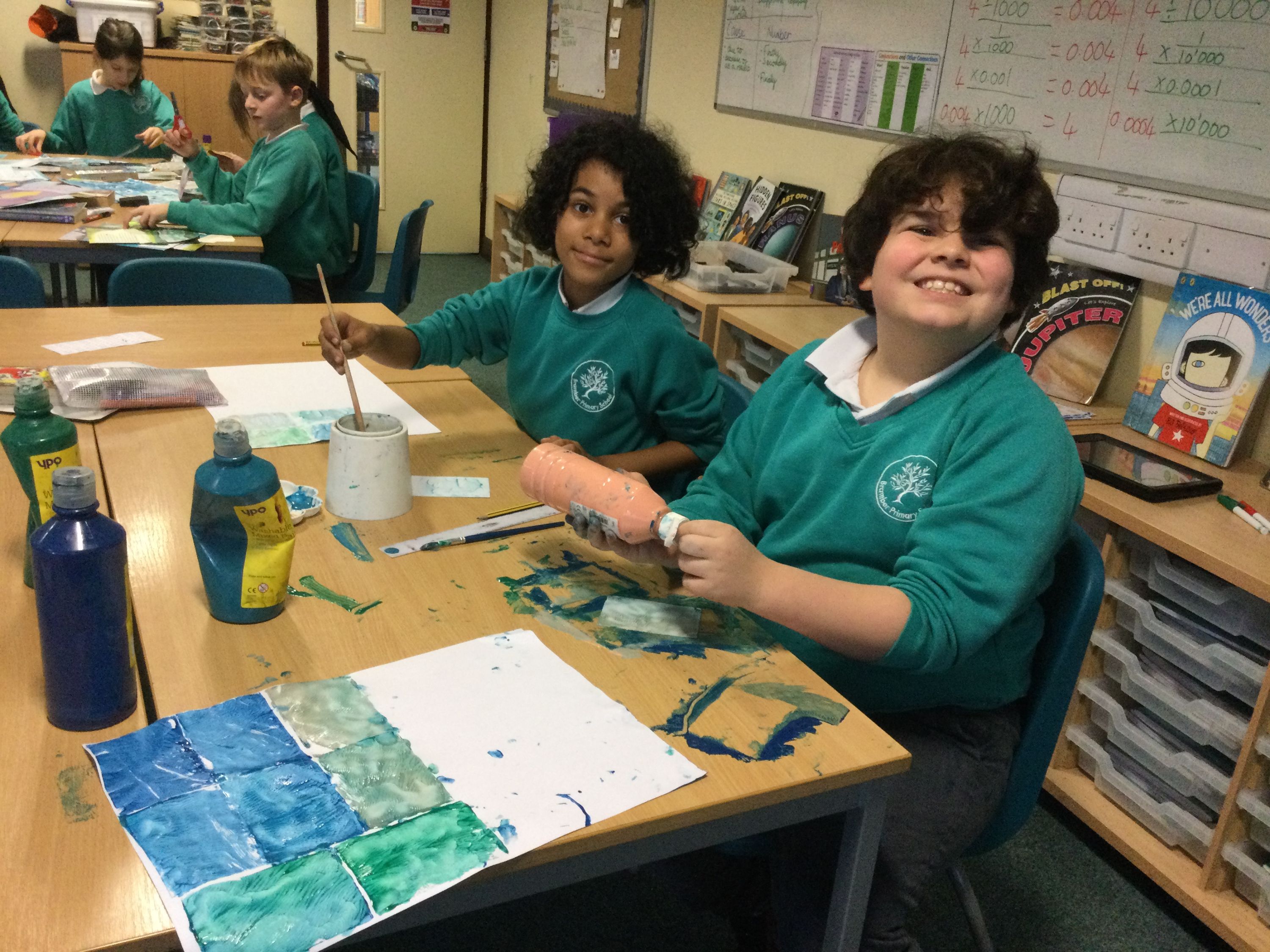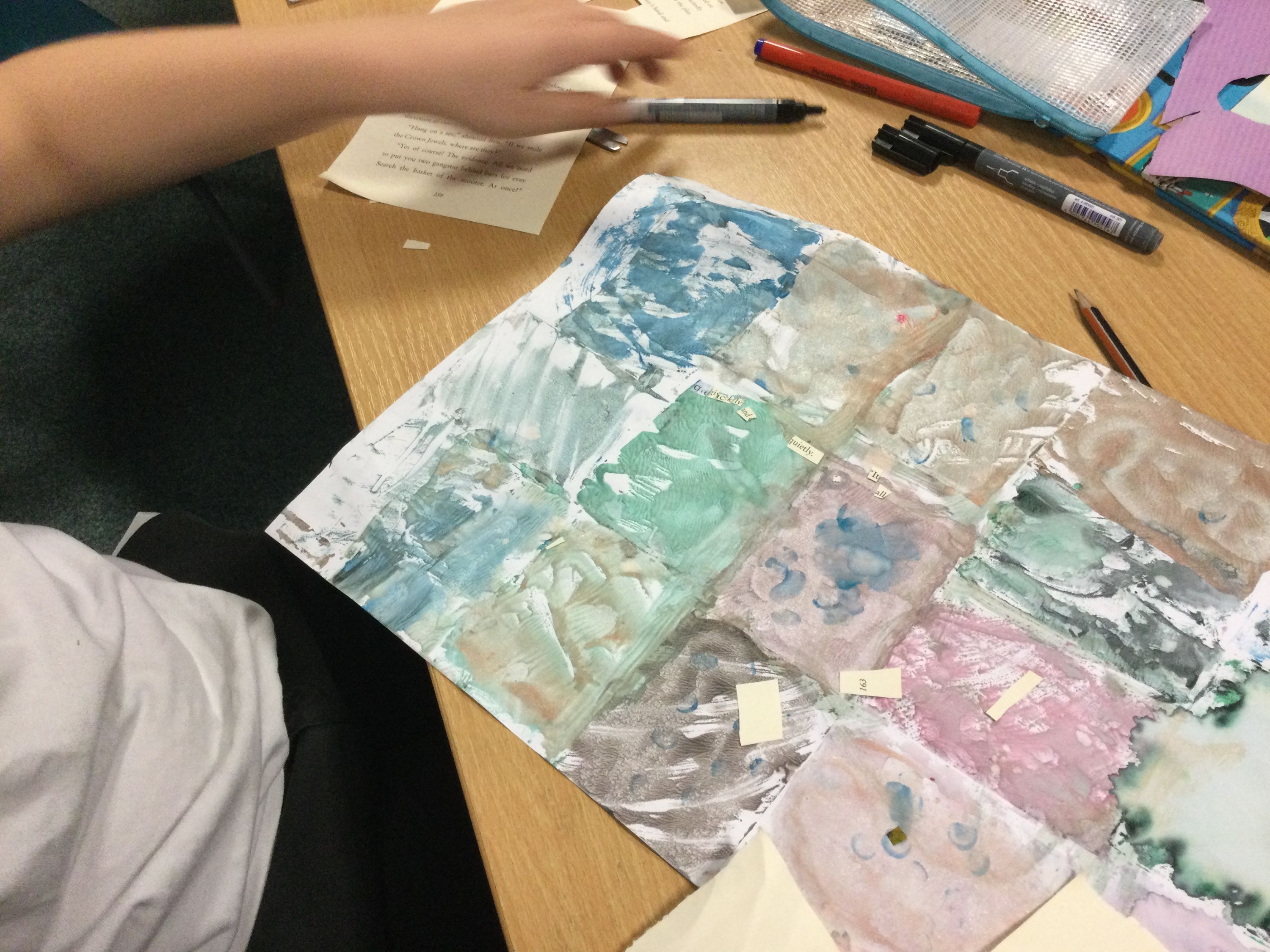 Using paint to stamp the backgrounds of our monotypes.